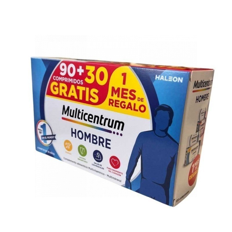 ulticentrum Hombre 90+30 Comprimidos Pack Promocional es un suplemento nutricional con 13 vitaminas y 11 minerales diseñado para hombres mayores de 18 años.