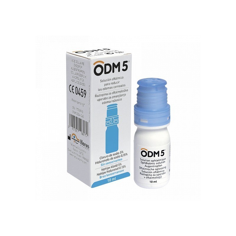 PRESENTACIÓN: Frasco multidosis de 10 ml sin conservantes. COMPOSICIÓN: Cloruro de sodio 5%, hialuronato de sodio 0,15%. Otros ingredientes: Agua purificada, citrato trisódico dihidratado, ácido cítrico monohidratado, hidroxipropilmetilcelulosa. ODM 5® contiene hialuronato de sodio, un elemento presente en el ojo de manera natural que, por sus propiedades lubricantes, ayuda a proteger la córnea. ¿EN QUÉ CASOS UTILIZAR ODM 5®? ODM 5® está indicado para reducir los edemas corneales: edemas ocasionados por distrofias corneales, edemas post-traumáticos y edemas post-quirúrgicos. Los edemas corneales se caracterizan por un exceso de fluidos en la córnea. ODM 5®, solución hipersalina, expulsa por efecto osmótico el exceso de estos fluidos fuera de la córnea, lo que permite recuperar transitoriamente un estado de hidratación normal. De esta manera, ODM 5® ayuda a mejorar su calidad de visión. ¿CÓMO UTILIZAR ODM 5®? • Lávese cuidadosamente las manos antes de usar la solución. • Instile 1 o 2 gotas 4 veces al día según las recomendaciones de su médico. Instile las gotas en el interior del saco conjuntival inferior del ojo, para ello, mire hacia arriba y tire ligeramente hacia abajo del párpado inferior. • Tras la instilación mantenga el ojo cerrado durante 1 o 2 minutos. • Evitar el contacto de la punta del frasco con el ojo o los párpados. • No requiere aclarado tras la utilización. • VÍA OFTÁLMICA.