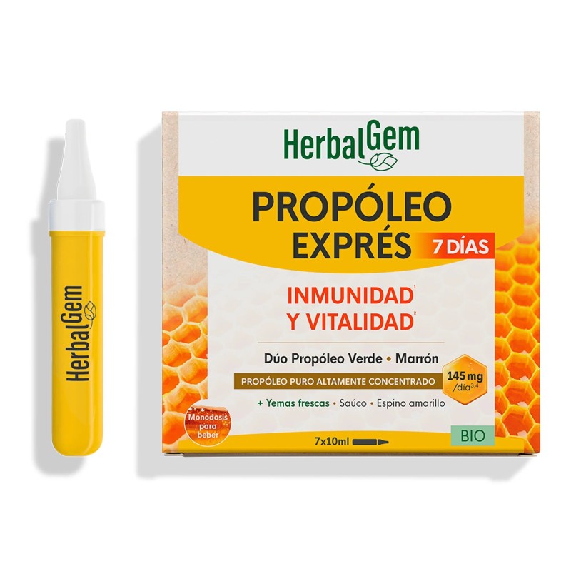 cada dosis contiene 145 mg de propóleo puro. El propóleo marrón, con propiedades antioxidantes, se combina con el propóleo verde, que contribuye a reforzar el sistema inmunitario. Las monodosis también contienen zumo de espino amarillo y brotes jóvenes de rosa mosqueta, que contribuyen a reforzar el sistema inmunitario. La yema de grosellero negro refuerza la acción de las otras yemas y actúa como tónico para el organismo, del mismo modo que la savia de abedul.